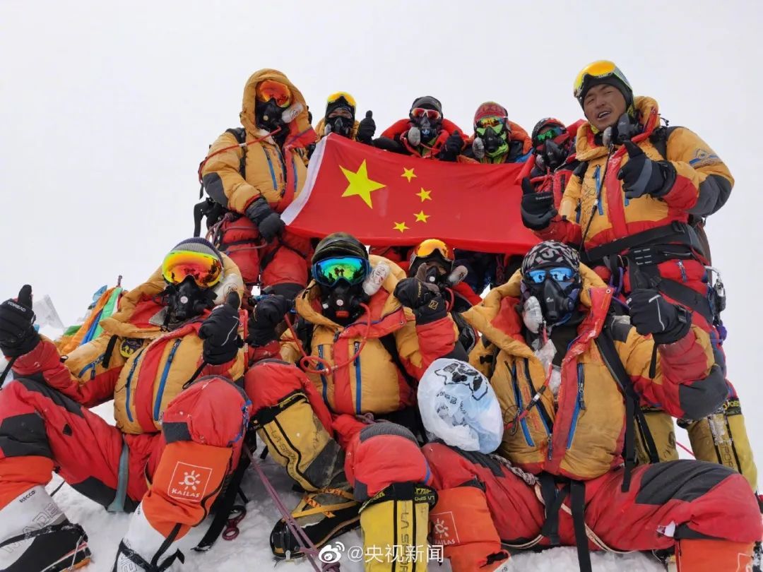 科考登山队员在珠峰峰顶展示五星红旗。图片来源:@央视新闻