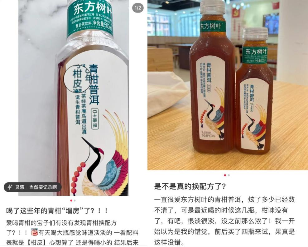 “爱喝青柑的宝子们有没有发现换配方了?”在发觉东方树叶(青柑普洱口味)饮品的口感发生变动后,塔塔在个人小红书账号上发布了一篇帖子,随即引发网友热议。