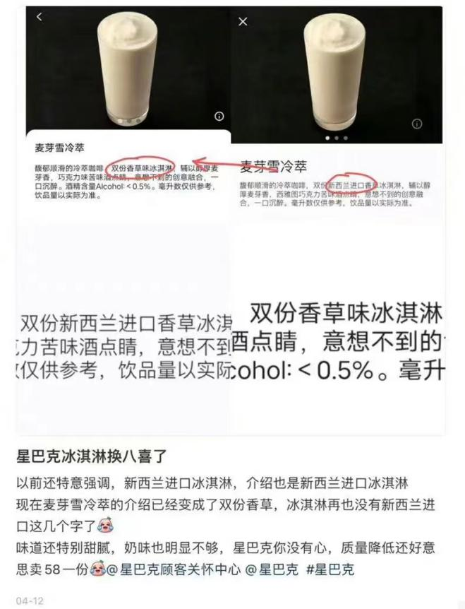 同样陷入原料“减配”质疑的,还有饮品巨头星巴克。据媒体此前报道,5月中旬,星巴克旗下一款最贵单品——麦芽雪冷萃的冰激凌,被曝出原料悄然从“新西兰进口香草冰激凌”变更为“国产八喜香草味冰激凌”,但价格依旧保持58元不变。
