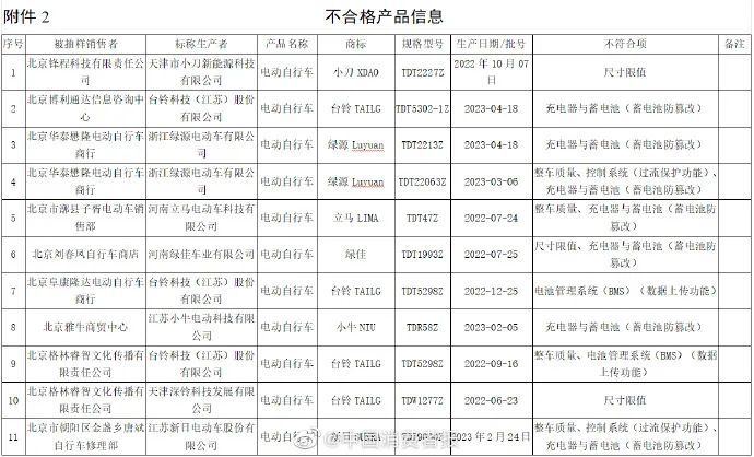 近日,北京市市场监管局公示电动自行车产品质量监督抽查结果(2023年第2批)。本次该局组织开展了北京市非机动车(电动自行车)产品质量监督抽查,抽查依据电动自行车国家标准及相关产品标准检出11组样品实物质量不符合相关标准,检验结果不合格。不合格产品涉及天津市小刀新能源科技有限公司、台铃科技(江苏)股份有限公司、河南立马电动车科技有限公司、河南绿佳车业有限公司、江苏小牛电动科技有限公司、江苏新日电动车股份有限公司等标称生产企业;商标涉及小刀XDAO、台铃TAILG、立马LIMA、小牛NIU、新日SUNRA等。不合格项目涉及尺寸限值、充电器与蓄电池(蓄电池防篡改)、整车质量、控制系统(过流保护功能)等。