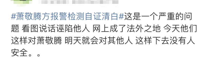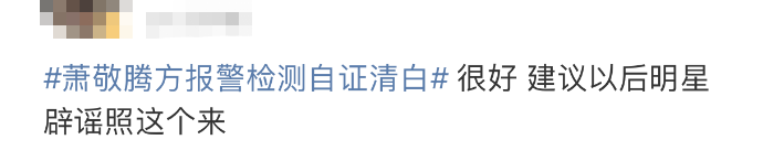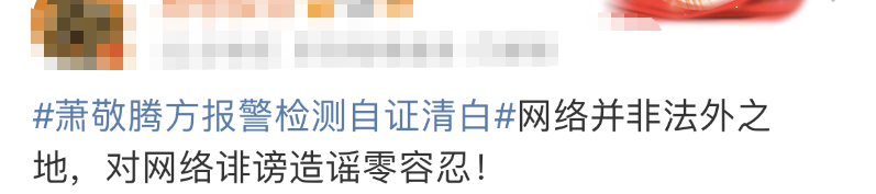 我司艺人萧敬腾 先生坚决遵守国家法律法规,严于律己。网络并非法外之地,我司对网络诽谤造谣零容忍!诽谤事件发生后,我司及时联系权威检测机构进行毛发检测,结果显示未检出任何毒品成分,并在与律师团队商议后,决定做报警处理,希望这场网络诽谤就此终止,也希望大家可以共同维护网络环境健康良好发展,坚决抵制造谣诽谤行为!