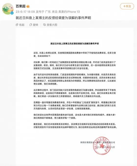 6月17日,@百果园发布声明称,近日,抖音上有博主反馈,在使用百果园团购消费券中有不愉悦的消费体验。对此,公司成立了由集团到区域的联合调查处理小组,并对该门店及监控进行了反复调查、核实。经核查发现,店员在该博主购买西瓜时表达了,该瓜甜度没有那么高但因为价格便宜,所以消费者购买的比较多,以此被该博主误解,我们深感抱歉。截至目前,公司仍未有效联系到该博主,该博主在视频评论区的描述经目前调查未发现。