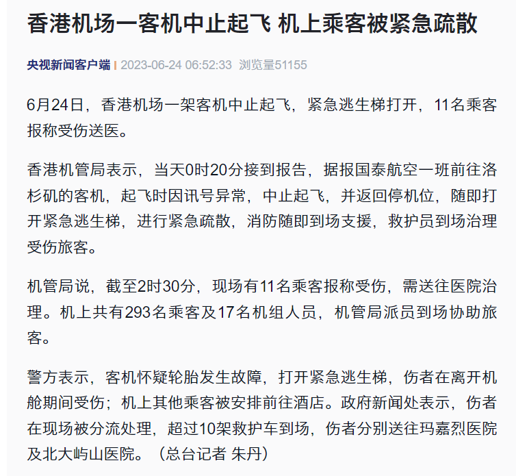6月24日,香港机场一架客机中止起飞,紧急逃生梯打开,11名乘客报称受伤送医。