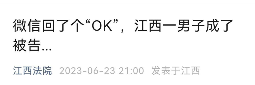 6月23日,江西法院微信公众号一篇《回了个“OK”,江西一男子成了被告》文章引起网友高度关注。