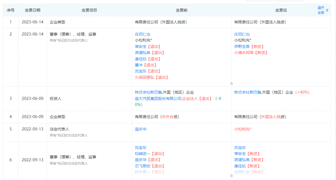 上述变动意味着,斯巴鲁在中国市场将转向独资发展。记者查阅企查查信息后发现,斯巴鲁中国的股东信息变动发生在6月9日。随后在6月14日,斯巴鲁中国的董事(理事)、经理、监事也有变动,常安全、滨道弘典、湊佳纪、董冲、沈宝东、久保田朋弘等退出,伊野圭吾和小清水邦周则为“新进”状态,分别担任监事和董事。