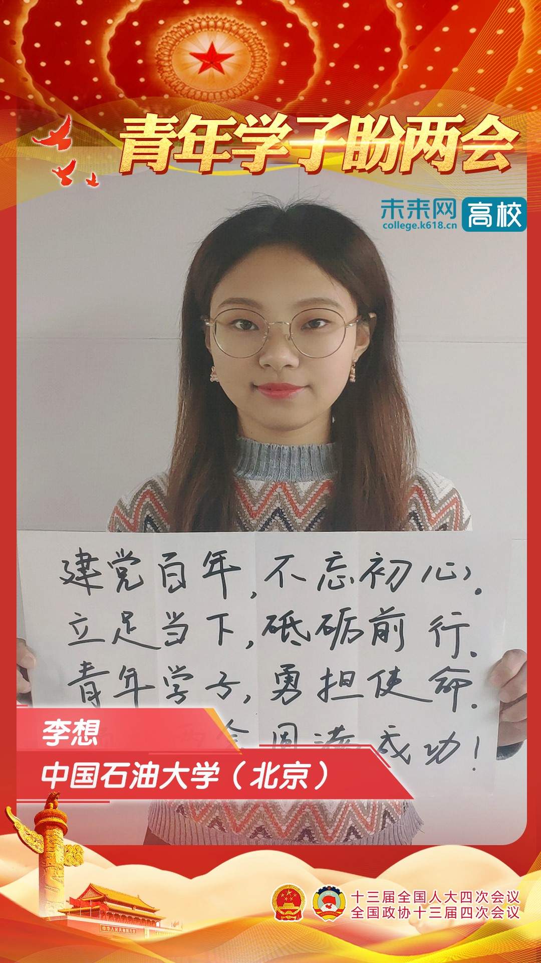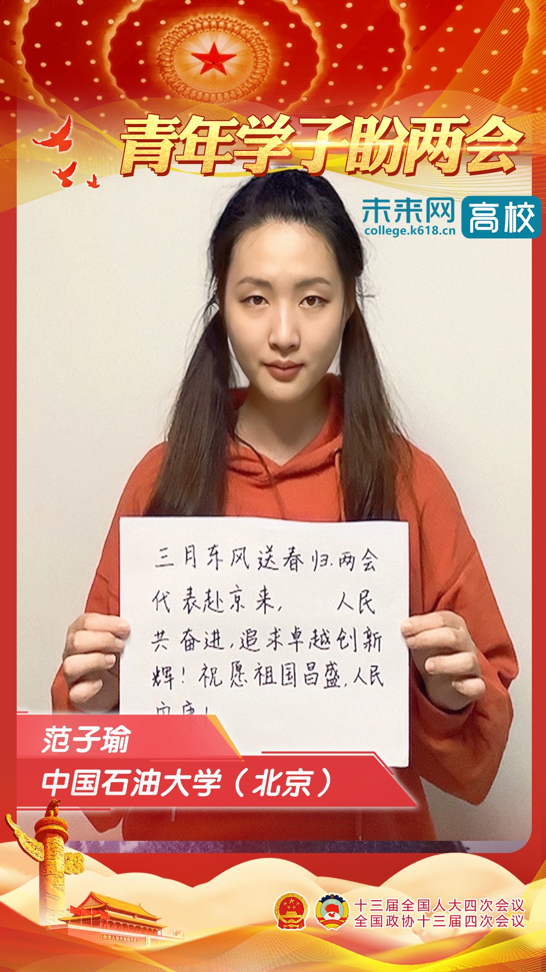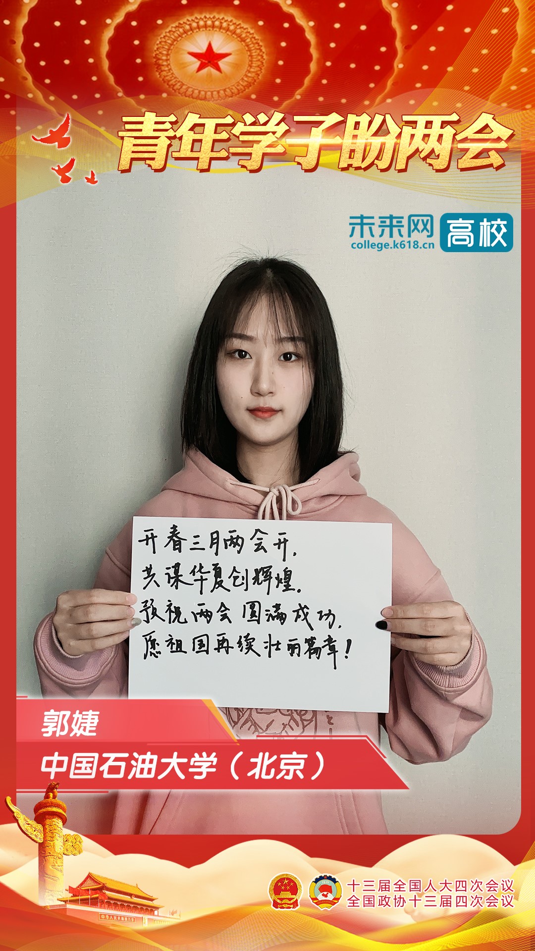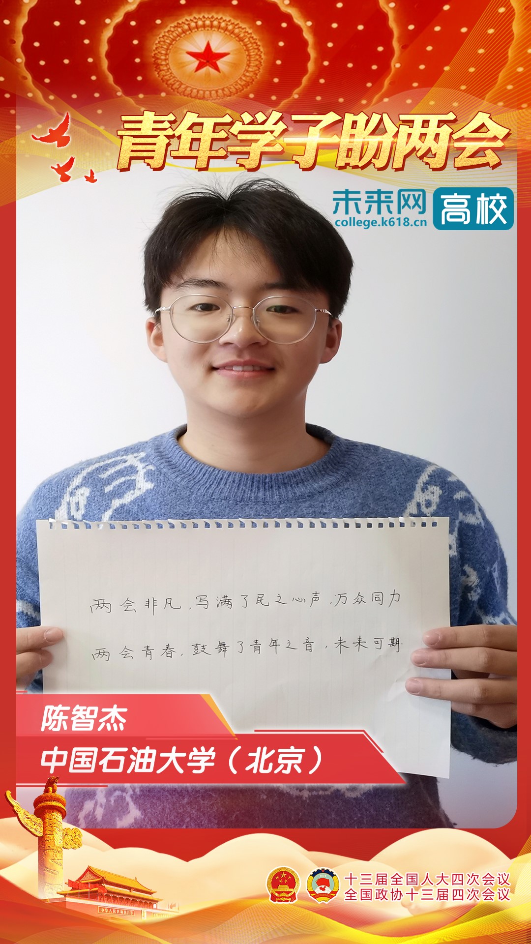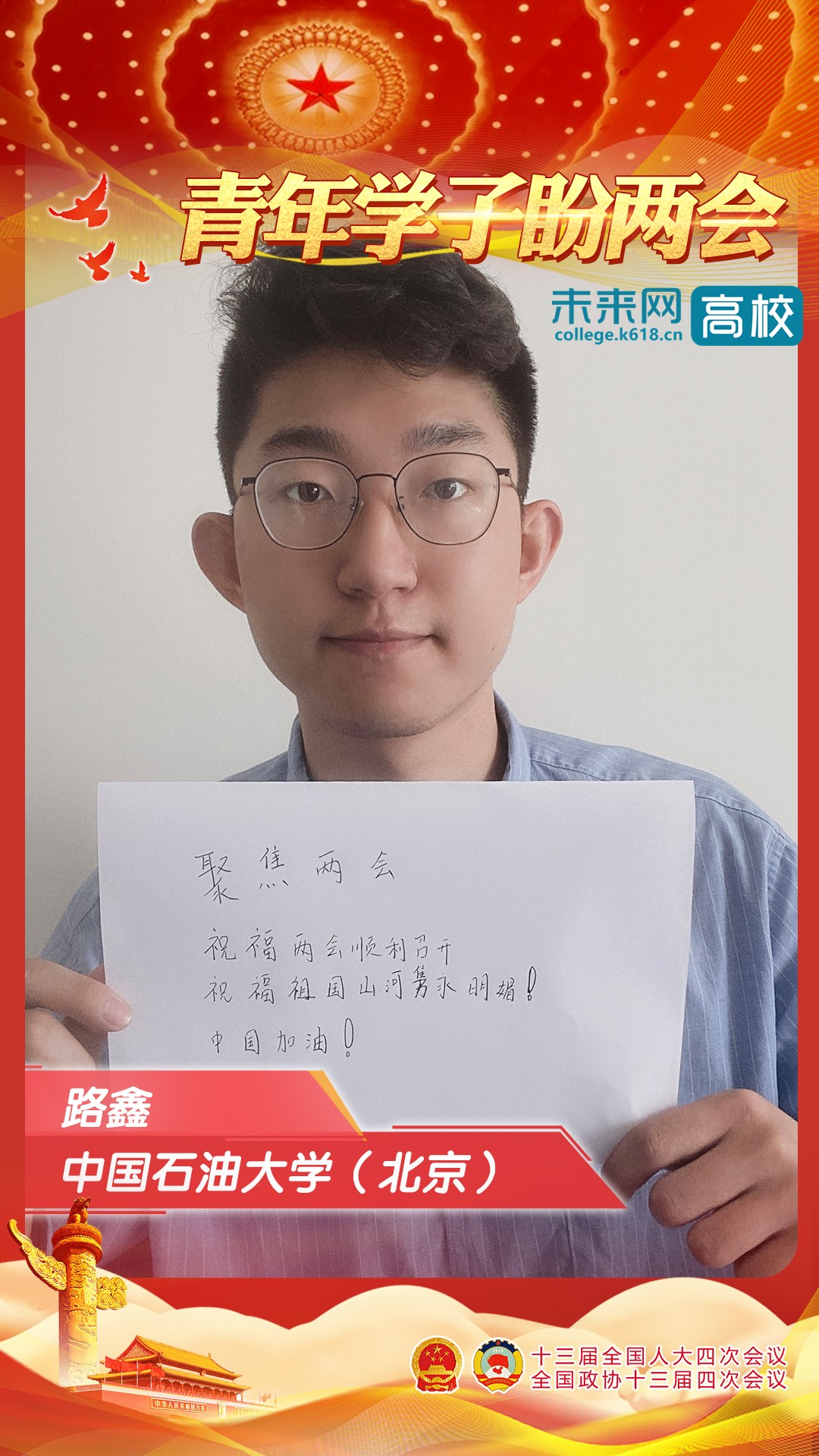 全国两会期间,未来网高校频道推出特别策划“高校青年学子寄语两会”。全国高校青年学子热切关注两会召开,向两会表达期待,向伟大祖国表达祝福!以下是来自中国石油大学(北京)青年学子的两会寄语。