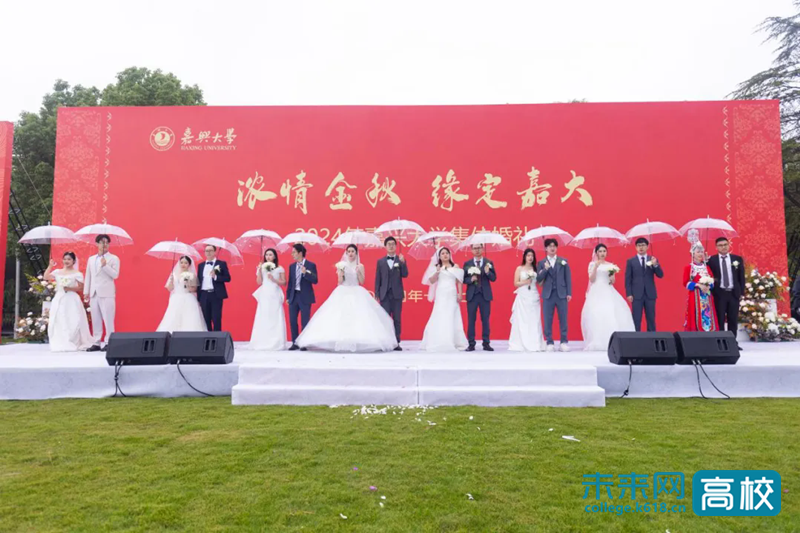 百十嘉大,百年好合;百十华诞,世纪真爱。10月7日上午,在嘉兴大学办学110周年校庆之际,“浓情金秋,缘定嘉大”校园集体婚礼在学校梁林校区东草坪举行。