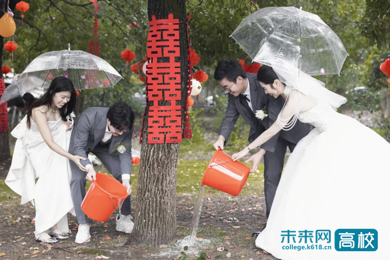 此时此刻,空气中弥漫着淡淡的花香和幸福的气息。新人们还共同为校园内的爱情树浇水,一同乘坐花车游览校园。婚礼在一边抛洒糖果、放飞气球一边演唱《爱的华尔兹》 中圆满礼成。(通讯员:周清)