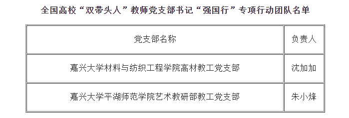 近日,教育部办公厅印发了《关于公布全国高校“双带头人”教师党支部书记“强国行”专项行动团队名单的通知》。嘉兴大学材料与纺织工程学院高材教工党支部、平湖师范学院艺术教研部教工党支部双双入选。