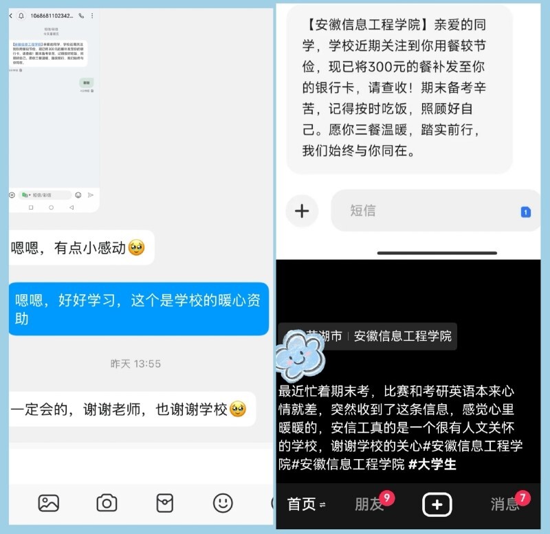 叮!一条来自学校的餐补短信提示让许多同学感受到了浓浓暖意——“亲爱的同学,学校近期关注到你用餐较节俭,现已将300元的餐补发至你的银行卡,请查收!期末备考辛苦,记得按时吃饭,照顾好自己。愿你三餐温暖,踏实前行,我们始终与你同在。”