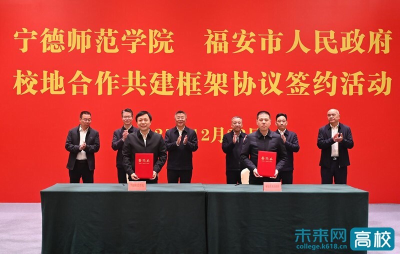 12月23日,宁德师范学院党委书记林清泉、党委副书记江潮炳、副校长颜桂炀一行赴福安市签订校地合作共建框架协议,并开展“十五五”规划编制工作调研,深入企业访企拓岗促就业。福安市委书记周祥祺,市长黄其山,市人大常委会主任詹廷平,市政协主席林志生参加座谈交流。