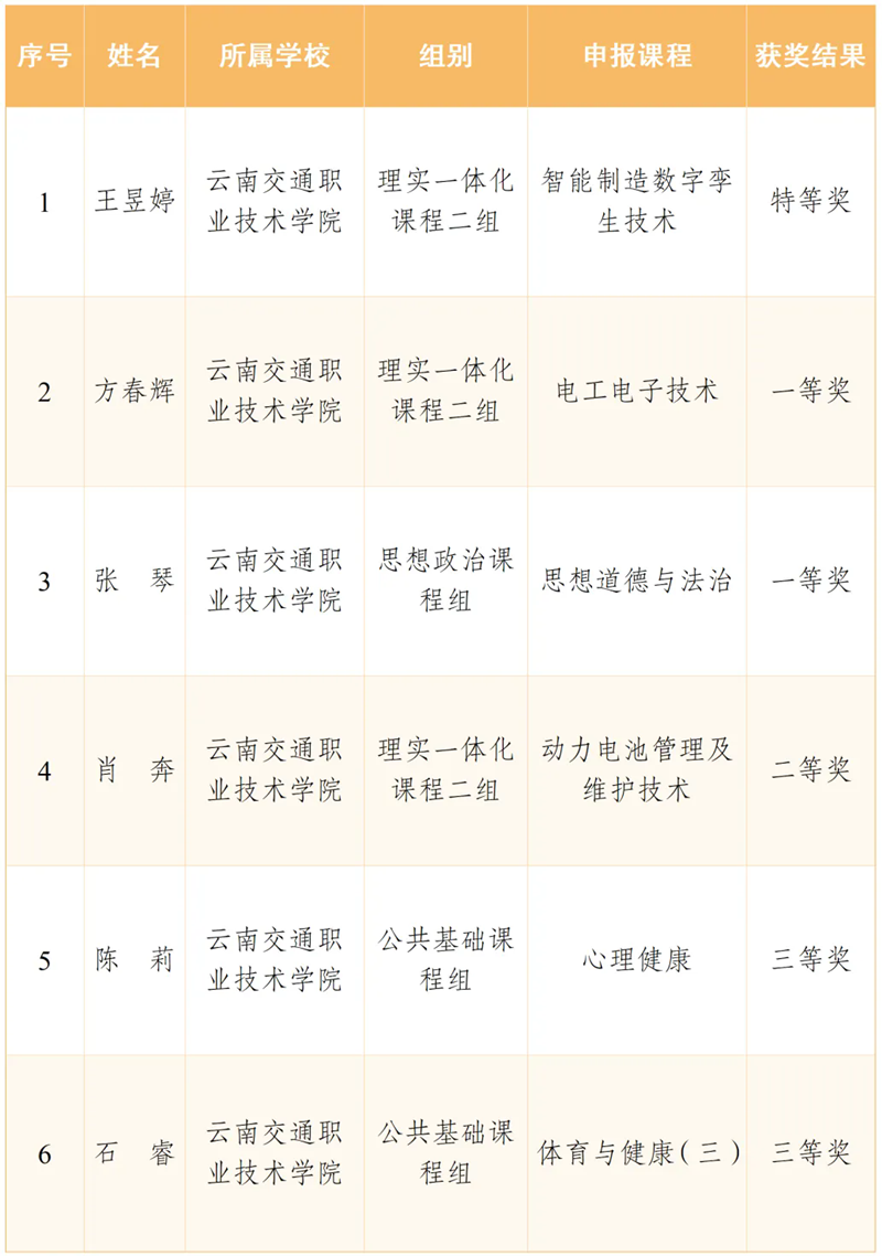 近日,由云南省总工会、云南省教育厅联合主办的第二届云南省高校青年教师教学能力大赛圆满落幕,云南交通职业技术学院教师凭借扎实的教学功底、创新的教学设计和出色的现场表现,斩获多项荣誉,展现了学校教师队伍过硬的教学能力和良好的育人风貌。