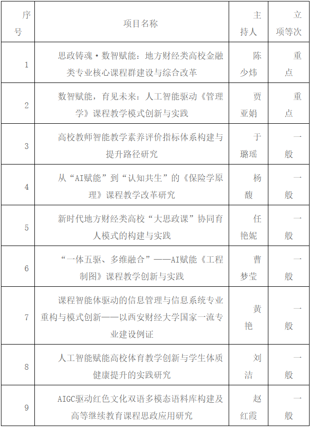 近日,陕西省教育厅公布了2025年度陕西本科及高等继续教育教学改革研究项目立项名单,西安财经大学共有9个项目成功获批立项,其中重点项目2项,一般项目7项,充分体现了该校在教育教学改革方面的持续探索与研究积累。