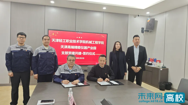 2月2日上午,天津轻工职业技术学院机械工程学院党总支部与天津高端精密仪器产业园党支部举行党建共建签约仪式。天津高端精密仪器产业园董事长李明山、党支部书记单莉莉,天津轻工职业技术学院机械工程学院党总支书记郭桦,党总支副书记、院长王宝龙出席了本次签约仪式,企业代表、教师代表参加了签约。