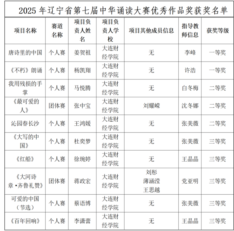 近日,2025年辽宁省第七届中华诵读大赛落幕。大连财经学院学子凭借扎实的素养和饱满的情感,累计获得一等奖2项、二等奖3项、三等奖5项,展现良好精神风貌。