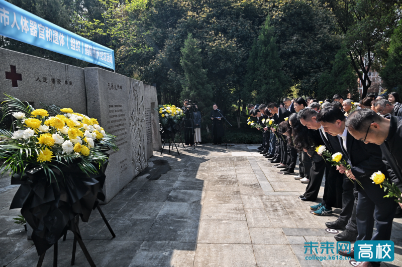 现场庄严肃穆,全体人员面向“无语良师碑”肃立,向人体器官和遗体(组织)捐献者三鞠躬,致以最崇高的敬意与最深切的缅怀;学生代表敬献花篮,表达对他们的无尽追思。