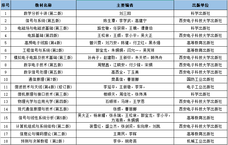 近日,教育部公示了“十四五”普通高等教育本科国家级规划教材拟入选名单,西安电子科技大学共有18本教材入选。据悉,此次学校共申报24本教材,获批率达75%,获批数量位居全省高校前列,体现了近年来学校教材建设的丰硕成果,为学校人才培养、学科建设提供了坚实的教学资源支撑。