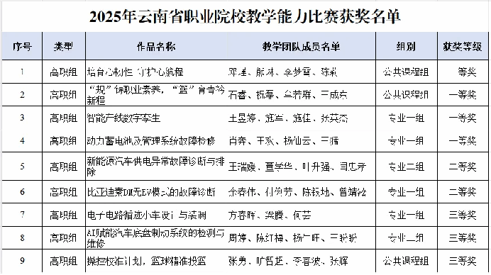 近日,云南省教育厅公布了2025年云南省职业院校教学能力比赛(高职组)获奖名单,云南交通职业技术学院教师团队表现亮眼,学校共12个团队参加比赛,成功斩获一等奖4项、二等奖2项、三等奖3项,充分彰显了学校深厚的教学底蕴与教师过硬的专业素养。