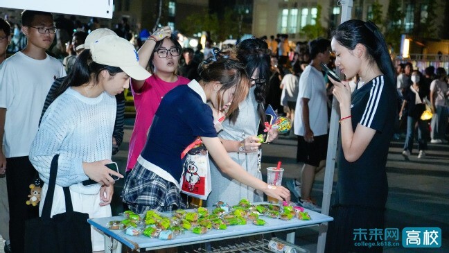 “月下非遗市集”堪称传统文化与校园特色的完美融合。市集内,一面面精美的扇面将书画艺术与传统美学完美结合;扎染体验区前同样人头攒动,师生们在非遗老师的耐心指导下,亲手将白布折叠、捆扎,再浸入调配好的染料中,感受传统扎染工艺“千变万化”的魅力。最后,一件件承载着个人创意的非遗作品,成为师生们留存校园文化记忆的珍贵信物。这些非遗体验项目让非遗技艺从陈列展品变为可触摸、可参与的现实乐趣,不少身着迷彩服的新生驻足体验,手中的扇面、扎染作品成为他们融入校园文化的第一份“纪念品”。