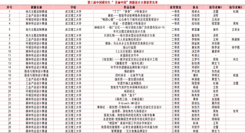 近日,第三届中国研究生“美丽中国”创新设计大赛全国总决赛在黑龙江大学落幕。武汉理工大学组织106支队伍参与环境空间设计、服装与服饰设计、工业产品设计、媒体传达设计、风景园林设计等五个专业赛道及地方主题定制赛道,荣获全国一等奖4项、二等奖10项、三等奖16项,其中一等奖获奖数量位列全国第七位;学校荣获大赛“优秀组织单位”称号。