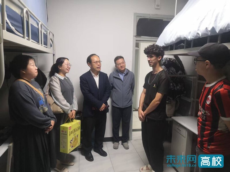 张进成来到北校区15号楼和4号楼国际学生公寓,与来自土库曼斯坦、摩洛哥、贝宁、刚果(金)等国的国际学生代表进行了亲切交流,代表学校向国际学生送去节日祝福,了解学生们学习生活情况以及困难,鼓励学生们融入中国社会和校园生活。国际学生们展示了自己的宿舍房间,对学校的关心和慰问表达了由衷的感谢,表示会继续努力学习汉语和专业知识,表达了对未来生活的美好愿景。