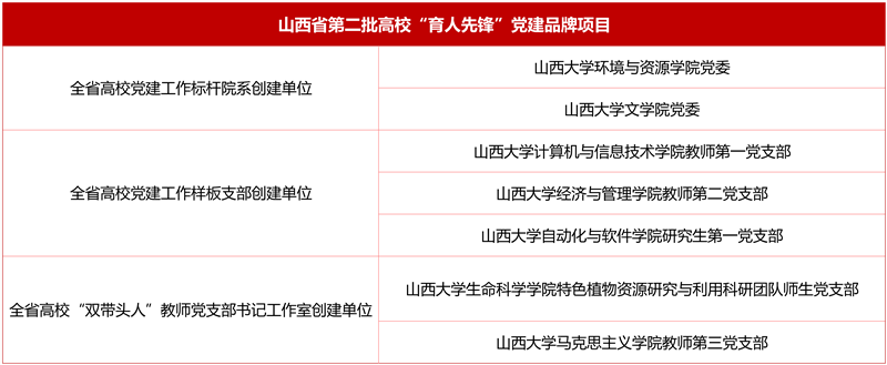近日,山西省委教育工委公布了山西省第二批高校“育人先锋”党建品牌项目,山西大学7个项目入选。其中,环境与资源学院党委、文学院党委入选全省高校党建工作标杆院系创建单位,计算机与信息技术学院教师第一党支部、经济与管理学院教师第二党支部、自动化与软件学院研究生第一党支部入选全省高校党建工作样板支部创建单位,生命科学学院特色植物资源研究与利用科研团队师生党支部、马克思主义学院教师第三党支部入选全省高校“双带头人”教师党支部书记工作室创建单位。