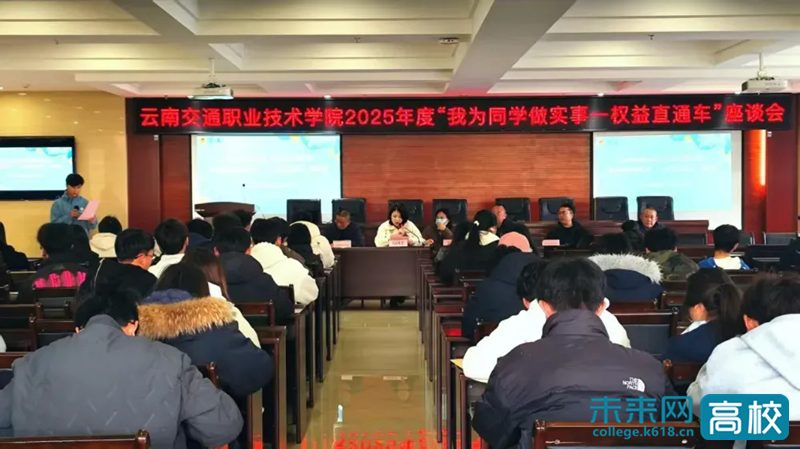 12月24日,云南交通职业技术学院召开2025年度“我为同学做实事——权益直通车”座谈会。学生处(学生工作部、武装部)、教务处、保卫处、招生与就业指导处、后勤保障中心、网络与信息化建设管理中心、学生公寓管理中心、后勤服务有限公司相关负责人、工作人员,校学生会、各学院学生会权益部全体工作人员及学生代表参会。