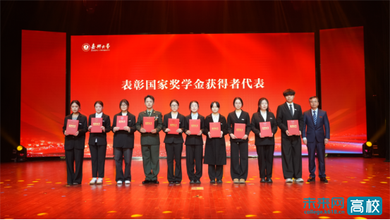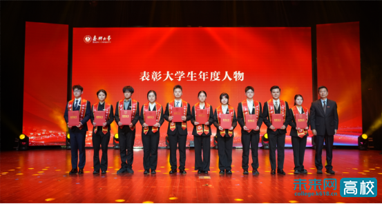 沈希为嘉兴大学2025年“大学生年度人物”颁奖。梅德庆为国家奖学金获得者代表颁奖。陈新友、张琦为体育艺术类竞赛获奖代表颁奖。张琦、周宏伟为发表高水平论文和授权发明专利的学生代表颁奖。於建明、陈立力为“挑战杯”与大创赛获奖团队代表颁奖。王德阳、周宏伟为光荣退役大学生士兵代表颁奖。张瑜、王立玮为无偿献血模范先锋代表颁发荣誉证书。