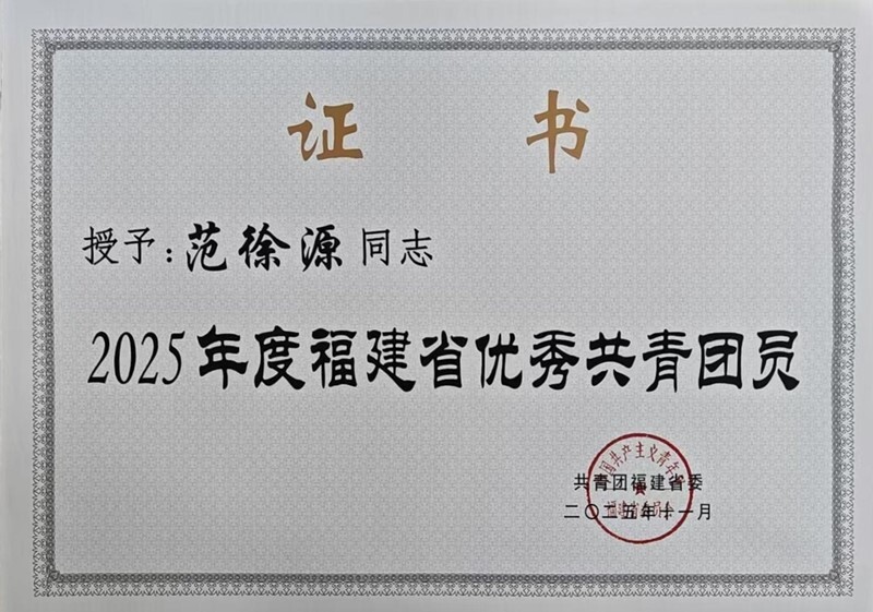 近日,共青团福建省委、福建省青年联合会联合印发《关于表彰2025年度福建青年五四奖章、福建新时代青年先锋、福建省五四红旗团委(团支部)、福建省优秀共青团员、福建省优秀共青团干部的决定》,宁德师范学院语言文化学院英语(师范)专业范徐源同学获评“2025年度福建省优秀共青团员”。