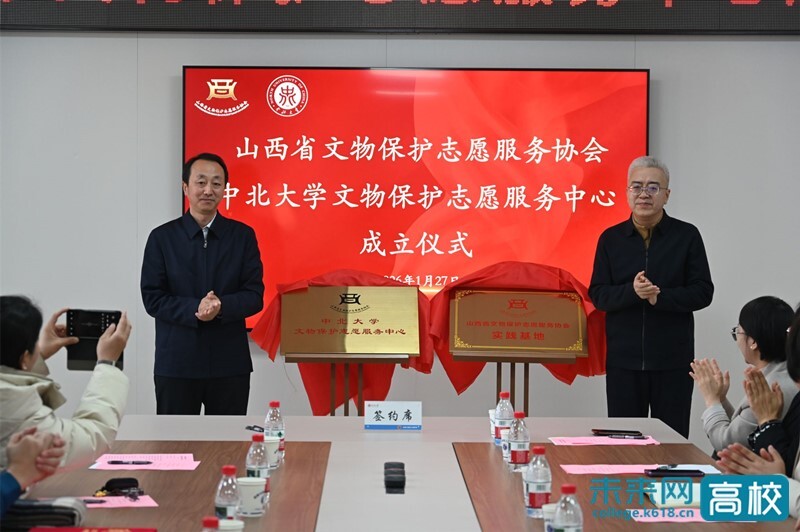 1月27日,山西省文物保护志愿服务协会——中北大学文物保护志愿服务中心成立仪式举行。中北大学党委副书记赵文军,山西省文物局副局长、省文物保护志愿服务协会会长白雪冰出席仪式,共同为中心揭牌,白雪冰还为中北大学文物保护志愿服务队队员代表授旗。山西省文物保护志愿服务协会常务副会长兼秘书长李强受聘为学校名誉教授,并代表协会与学校签署合作协议。