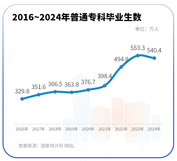 作为高技能人才培养的主阵地,高职院校毕业生正成为填补一线技能人才缺口的重要来源。国家统计局数据显示,我国普通专科毕业生人数从2016年的329.8万人增至2024年的540.4万人。这支生力军涌入就业市场之际,产业的智能化转型也令他们的就业流向发生转变。