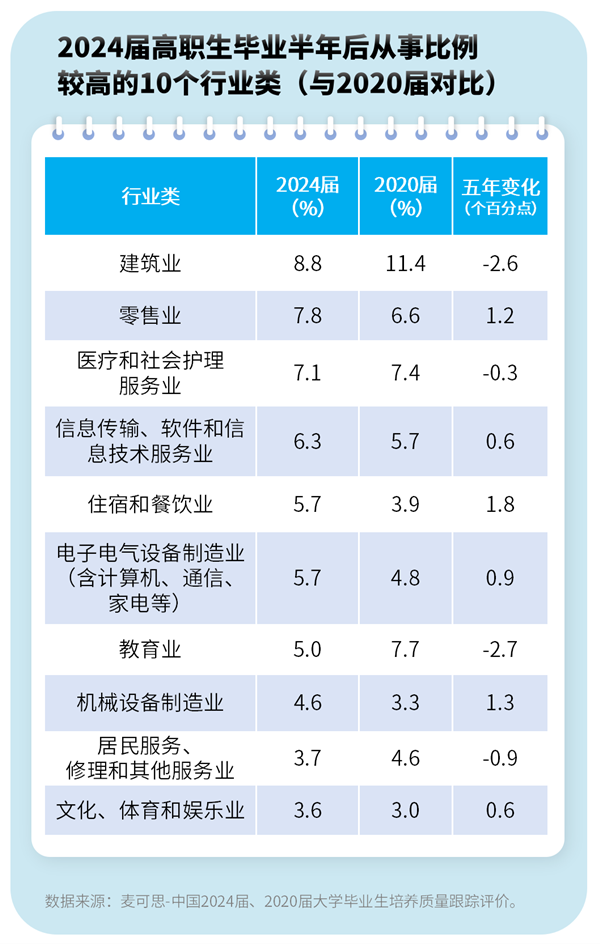 《2025年中国高职生就业报告》(就业蓝皮书)数据显示,建筑业、零售业、医疗和社会护理服务业是吸纳应届高职毕业生最多的3个行业类,2024届毕业半年后就业比例分别为8.8%、7.8%、7.1%。