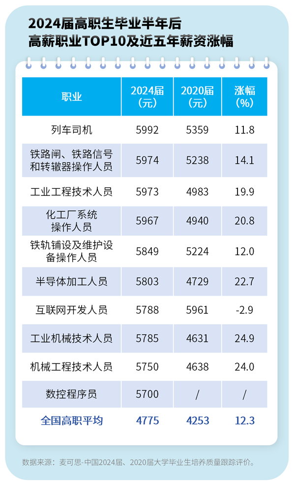 列车司机(5992元),铁路闸、铁路信号和转辙器操作人员(5974元),工业工程技术人员(5973元),化工厂系统操作人员(5967元)是2024届高职生从业薪资最高的4个职业,其薪资均高于同届的地方本科院校(即非“双一流”院校)毕业生的平均薪资(5882元)。