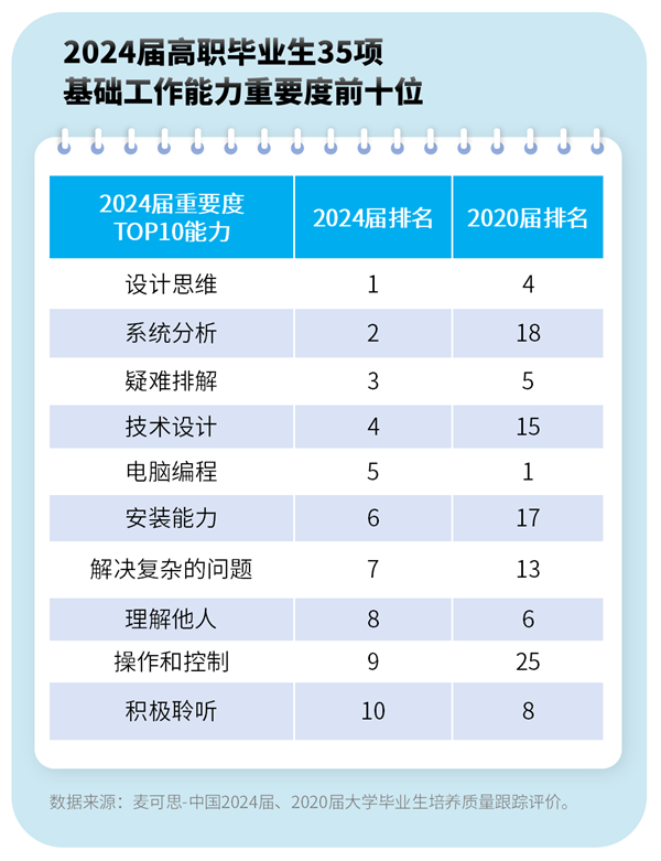 就业蓝皮书研究发现,当下岗位需求日益强调复合型能力。从近五年高职毕业生35项基础工作能力重要度TOP10变化来看,高职生的高阶综合判断与问题解决能力(如系统分析、疑难排解、解决复杂问题)的重要度显著提升;同时,技术创新与迭代设计能力(如设计思维、技术设计)的岗位重要性也迅速增强,要求高职生在实际约束条件下进行创新设计和持续改进。此外,沟通协作与服务意识能力(如理解他人、积极聆听)依然位居前列,体现了跨团队协作和客户服务的重要性。而传统技术应用与操作能力(如电脑编程)虽然仍是基础要求,但相对优势有所下降。