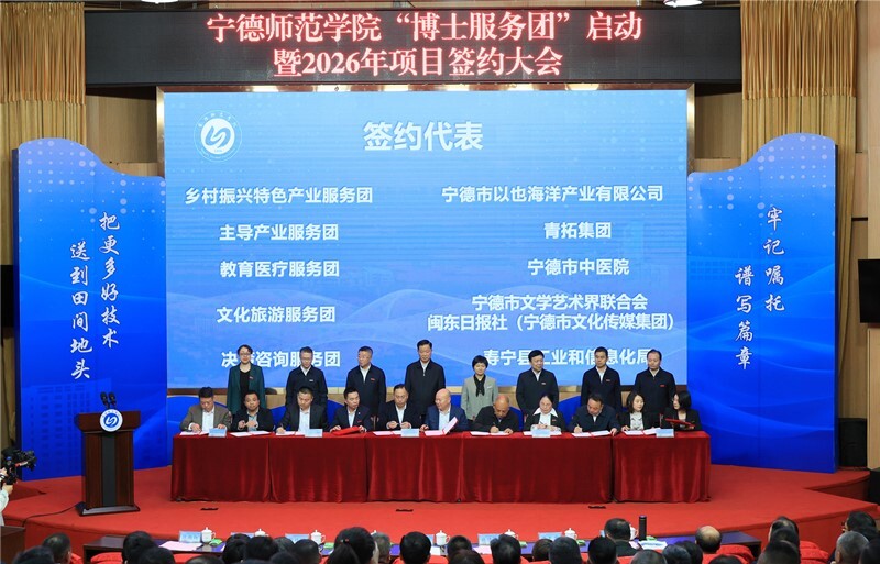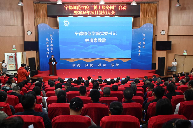 3月31日,宁德师范学院举行“博士服务团”启动暨2026年项目签约大会,全面推动科技创新成果加速转化为现实生产力,开启校地企深度协同、共赢发展的崭新篇章。此次大会备受社会各界关注,福建省教育厅,宁德市政府、市直相关部门及各县(市、区)负责人,宁德时代新能源科技有限公司、青拓集团、宁德市以也海洋产业有限公司等重点企业代表,齐聚一堂,6家企事业现场成功签约,进一步深化了产教融合、校企合作的战略伙伴关系。