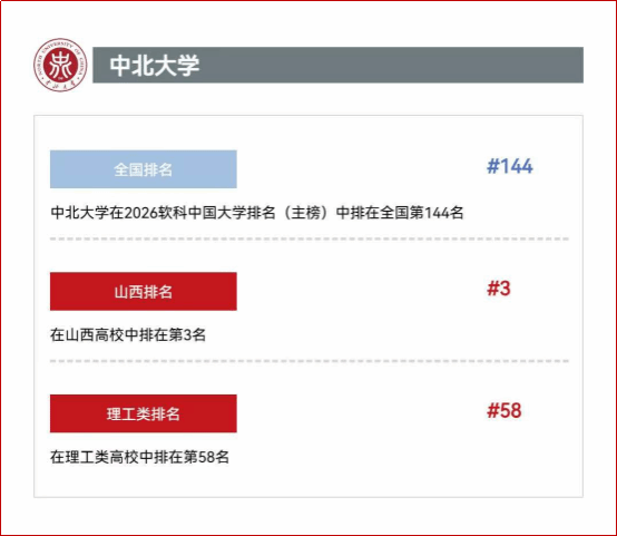 4月15日,高等教育专业评价机构软科发布“2026软科中国大学排名”,中北大学排名全国144名,较2025年排名上升29位,本次排名位次的提升幅度创学校历年新高,同时自2022年以来,该校在该榜单中已实现连续五年提升,累计上升44位。